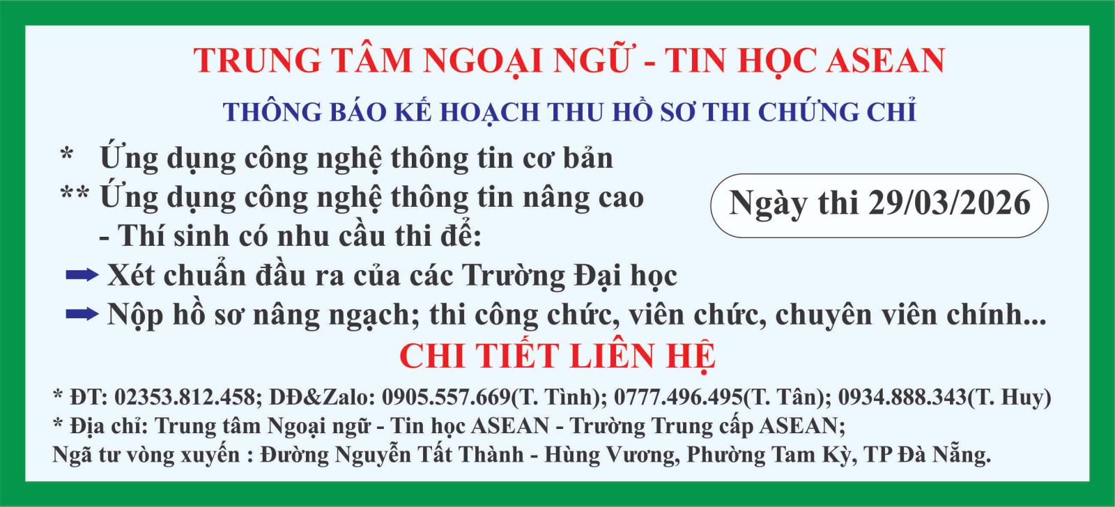 Trung tâm Ngoại ngữ - Tin học ASEAN thông báo kế hoạch thu nhận hồ sơ cho đợt thi vào chủ nhật ngày 29/03/2026 Trung tâm Ngoại ngữ - Tin học ASEAN thông báo kế hoạch thu nhận hồ sơ cho đợt thi vào chủ nhật ngày 29/03/2026